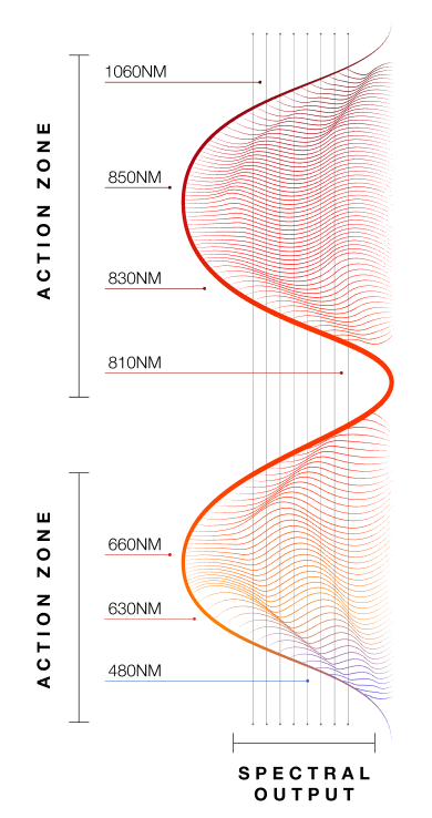 Patent Pending R+|NIR+ Advanced 7 Wave Spectrum: 480nm, 630nm, 660nm, 810nm, 830nm, 1060nm